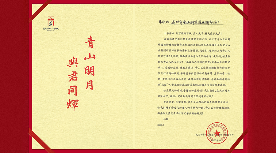 (武汉青山区新冠肺炎疫情防控指挥部给米兰科技的感谢信)